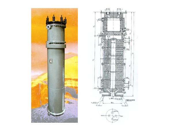 SHL型圓塊式石墨三合一鹽酸合成爐結(jié)構(gòu)示意如上圖,它集HCL氣體之合成、吸收、冷卻三功能于一體,結(jié)構(gòu)緊湊、強(qiáng)度高、生產(chǎn)能力調(diào)控范圍大,對(duì)原料氣要求不高,且效率高,成酸純度好,可達(dá)試劑級(jí),是當(dāng)今生產(chǎn)高濃度純鹽酸的理想設(shè)備。它可以用作P205水合塔,生產(chǎn)高濃度磷酸。(本公司制造之本型設(shè)備具獨(dú)有技術(shù)恕未此公開(kāi))。圖示為氯化氫合成爐結(jié)構(gòu)圖。技術(shù)特性:設(shè)計(jì)壓力Mpa 物料系統(tǒng)≤0.1,冷卻系統(tǒng)≤0.3設(shè)計(jì)
