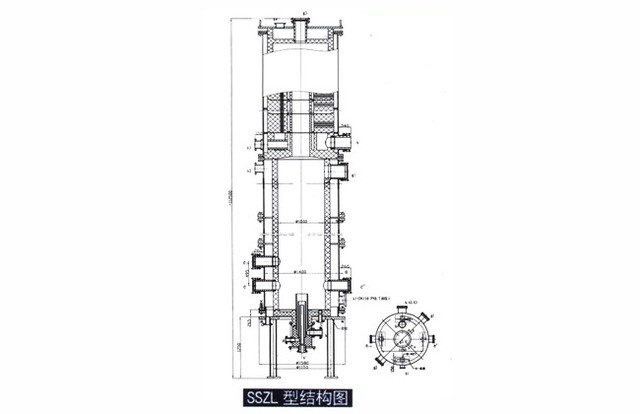 SSL型石墨氯化氫合成爐由爐底點(diǎn)火裝置,爐筒及鋼制冷卻套 組成,集氯化氫合成與冷卻二功能于一體,其突出優(yōu)點(diǎn)是:一、產(chǎn)品 不受污染,純度高;二、生產(chǎn)能力大且調(diào)節(jié)范圍大:三、使用壽命長(zhǎng) (操作正常時(shí)其壽命可達(dá)十年以上);四、生產(chǎn)現(xiàn)場(chǎng)流程更簡(jiǎn)化.勞 動(dòng)條件好且控制。管理方便。圖示為氯化氫合成爐結(jié)構(gòu)圖。技術(shù)特性:爐內(nèi) 水夾套設(shè)計(jì)壓力Mpa 0.06 常壓設(shè)計(jì)溫度℃ ≤350℃ ≤100技術(shù)標(biāo)